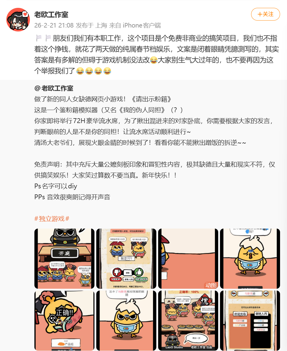 别看它微博只有1.1万转发,事实上,游戏的链接早在同人圈里传疯了。