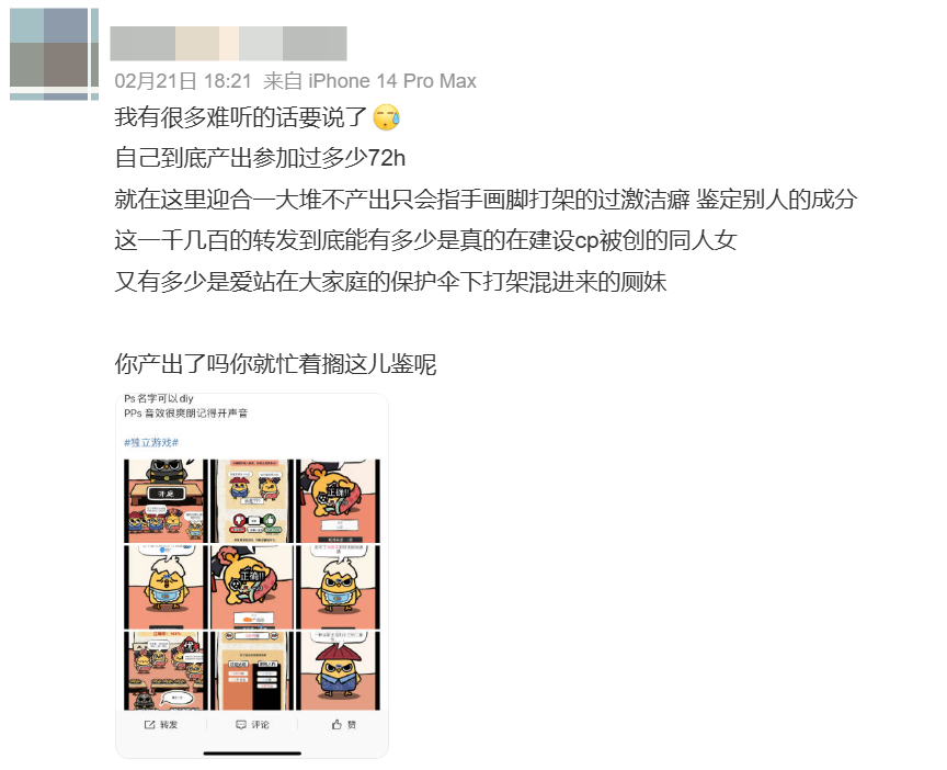 可叹的是,网友们对这款游戏的喜与恶,似乎也成为了同人圈扯头花、抢夺话语权的另一种投射……