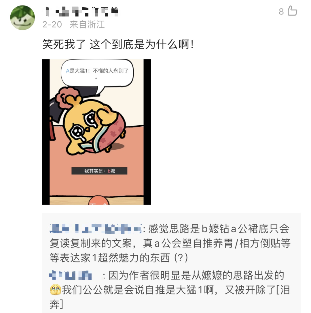 也有一些难以辨别的“披皮”话术:比如,说出“A当然是1啦,这也能嬷?”的宾客,看似是A的公公,实际上却是B的嬷嬷。(公公,指支持某个角色在任何关系中都当攻;嬷嬷,指支持某个角色在任何关系中都当受)