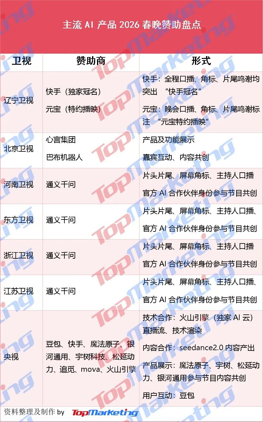 抖音旗下火山引擎、豆包分别成为春晚独家AI云平台及用户互动入口;腾讯系的元宝则是选择了收视率仅次央视的辽宁卫视;阿里冠名河南、东方、浙江、江苏卫视4个地方卫视;快手则是独家冠名辽宁卫视,精准覆盖“老铁文化”圈层。