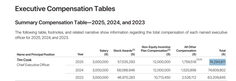 图:股东会上公布的库克2025年确认年薪和上一年几乎持平