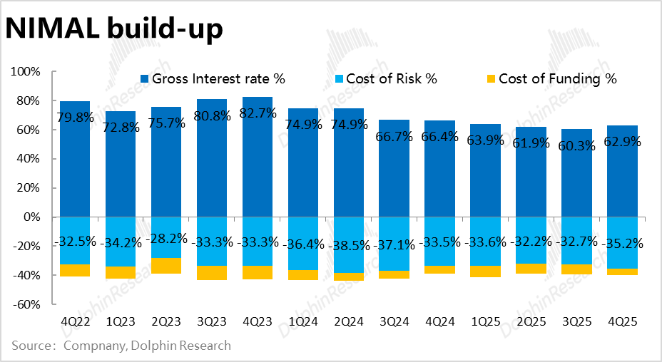 对应的,本季的贷款净息差NIMAL也从上季的21%改善到23.3%,除了上面提及的毛利率走高外,本季的资金成本也环比下降了超2pct,但部分被更高的坏账准备计提所对冲了。