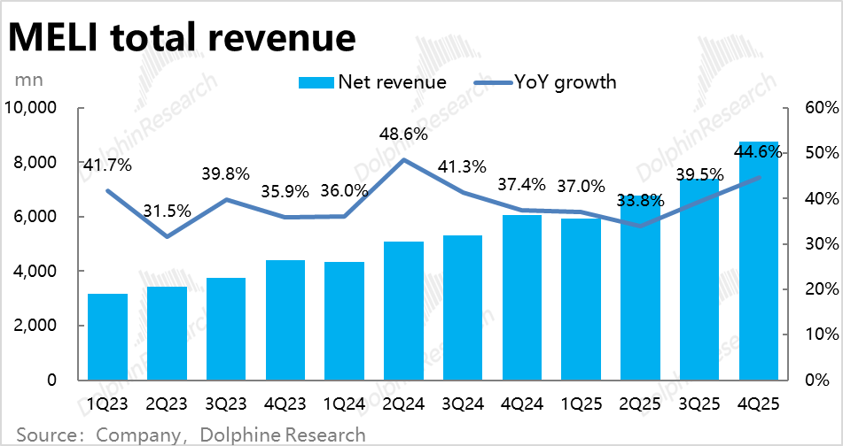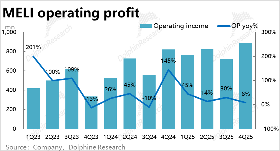 由于电商业务和信贷业务都增长不俗,本季Meli整体营收同比增长了近45%到87.6亿,环比有不小提速,且高于彭博一致预期约3pct。增长端的表现可以说不错。