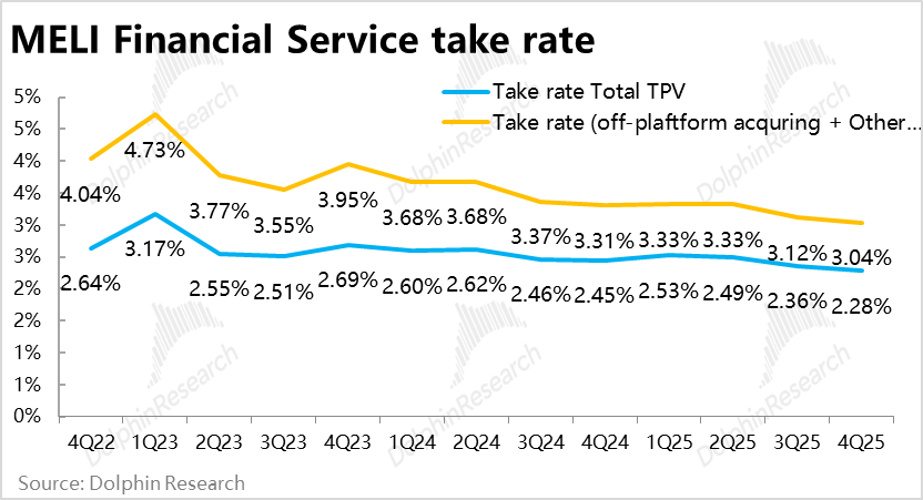 以支付手续收入为主的金融服务性收入本季同比增长33%,增速不增反降。如海豚君多次提及的,支付业务的变现率有长期走低的趋势。本季无论是按总支付额,还是按收单性支付额测算出的手续费了都在继续环比下降。