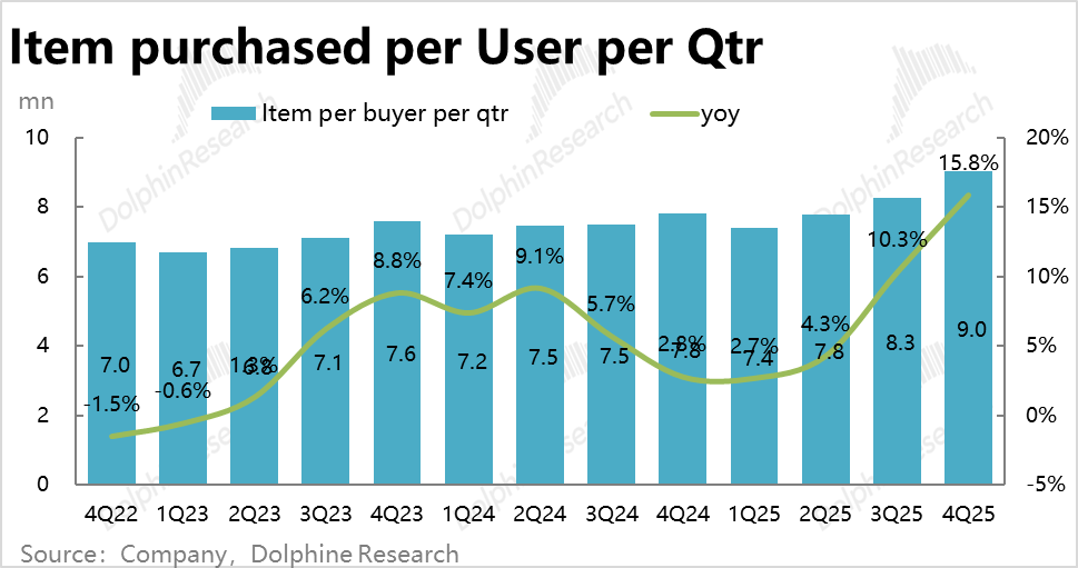 更进一步看,本季人均下单量本季达到9次,同比大幅提升了16%,是增长加速的最本质原因,更清晰的体现了免邮门槛下降后,用户下单意愿的上升。