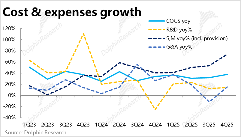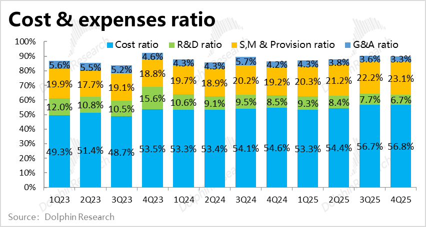 从成本和费用角度,本季的毛利率为43.2%,同比收窄了超2pct。虽然公司不披露各个板块毛利率细节,但结合上文的分析,电商板块的免邮门槛下调、支付业务和信贷业务同比角度的变现率也都在走低。毛利率下滑并不意外。