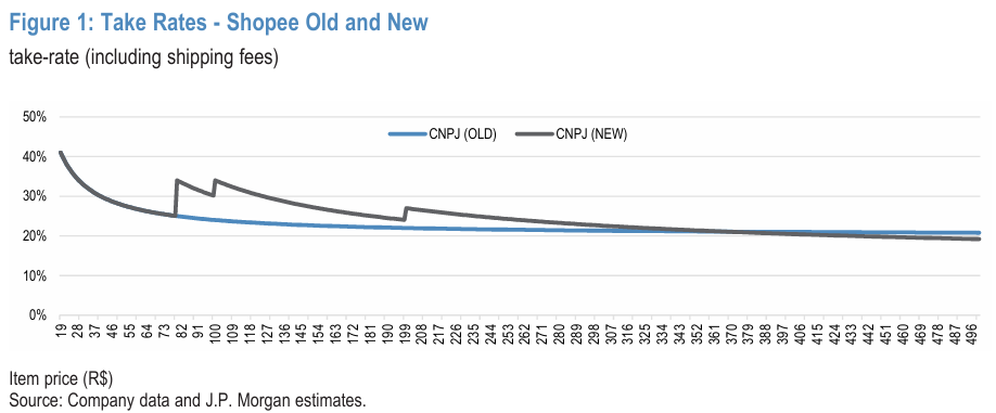 主要变化是,市占率第二的Shopee近期在巴西市场连续调高了变现率,包括:a. 对个人卖家收取的每单服务费从R$5上调到R$7(40%的调升); b. 对企业卖家的佣金曲线也做出调整,由下图可见主要变化是拉升了R$80~ R$300这一价格区间内商品的佣金率。