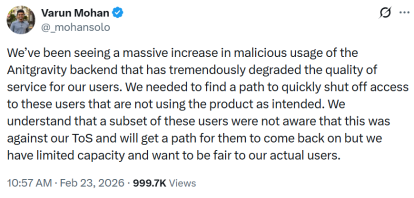 他在X上写道:“使用Antigravity的要小心了。我想我会移除对它的支持。Anthropic 至少会联系我,对问题的处理也很友好。谷歌呢?直接封禁。”