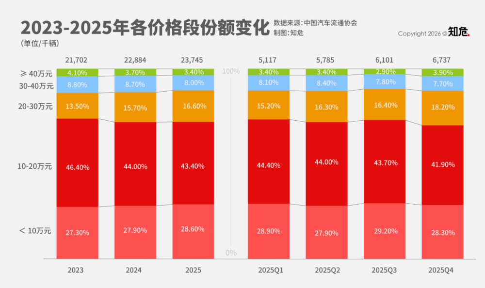 从大环境看,近些年经济环境并不算太好。当有钱人赚钱变难,自然就会把钱省着花。从中汽协数据可以看出,2023-2025年间,40万及以上的市场份额在逐步下降,年销量也从2023年的88.9万跌落至84.6万,再到2025年的80.7万。虽然是销量下滑的幅度并不算大,但也可以大致看出国人在购中高端车型的意愿程度。