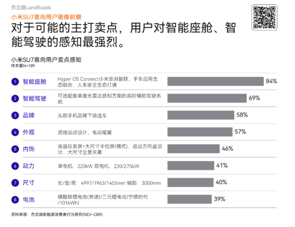 这时候或许有人会反驳,小米汽车打着“高性能”、“速度”、“跑赛道”的旗号,不是卖得风生水起吗。但是从调研机构杰兰路发布的小米SU7意向用户画像、小米YU7首批用户画像研究来看,“动力”这一卖点并不属于小米用户的主要购车决策因素,只排在了第6位,大家更注重的依然是智能座舱、智驾以及外观。
