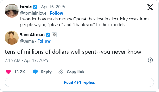 曾有人在在X上发帖说:“我想知道OpenAI因为人们对他们的模型说‘请’和‘谢谢’而损失了多少电费。”