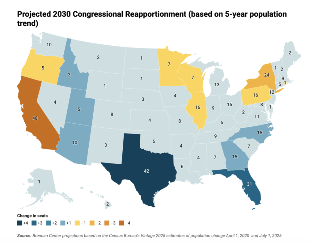 基于五年人口趋势的2030年美国国会重新分配席位的预测。数据来自美国人口普查局2025年的预测数据。