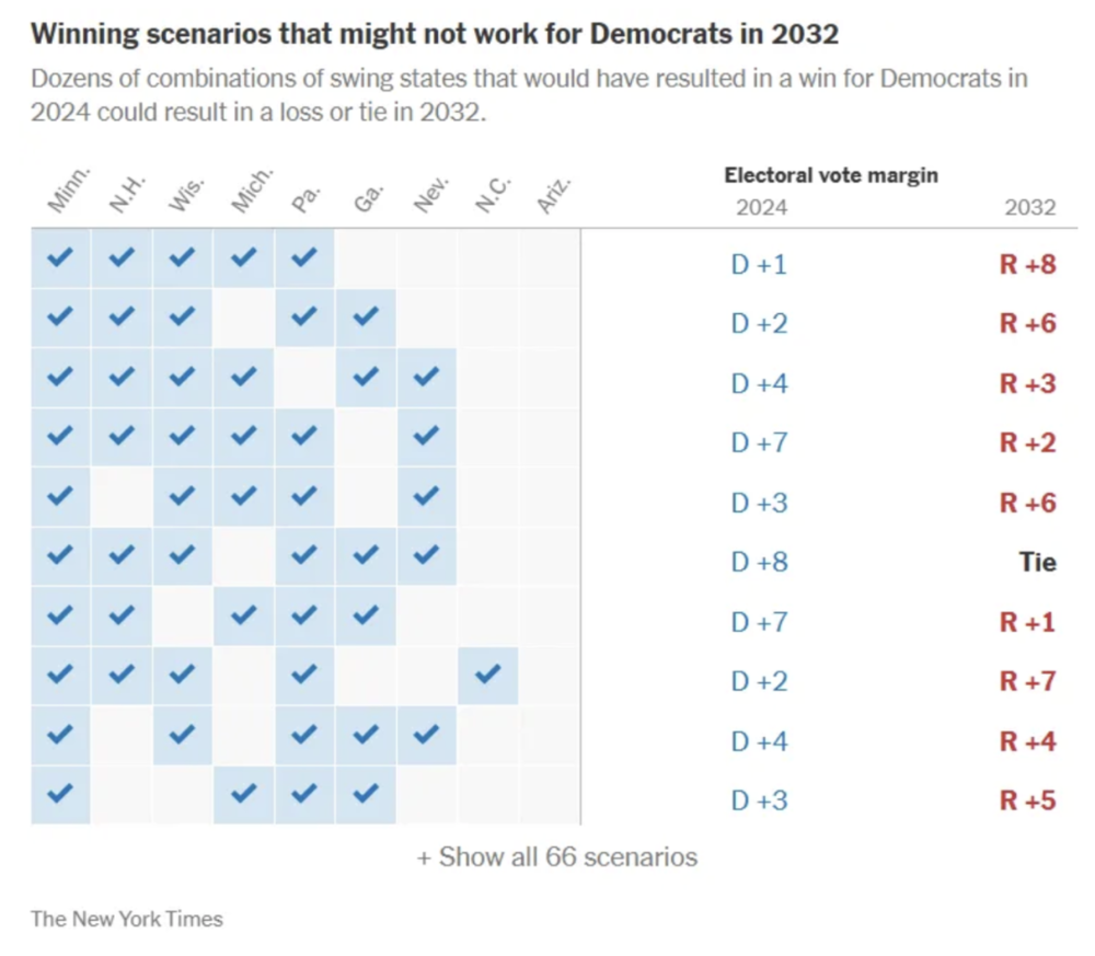 这张图展示了多种在2024年可能帮助哈里斯获胜的摇摆州组合,但根据人口普查预测,这些组合在2032年将不再产生民主党胜利,反而可能导致共和党获胜或选举平局。图源:纽约时报