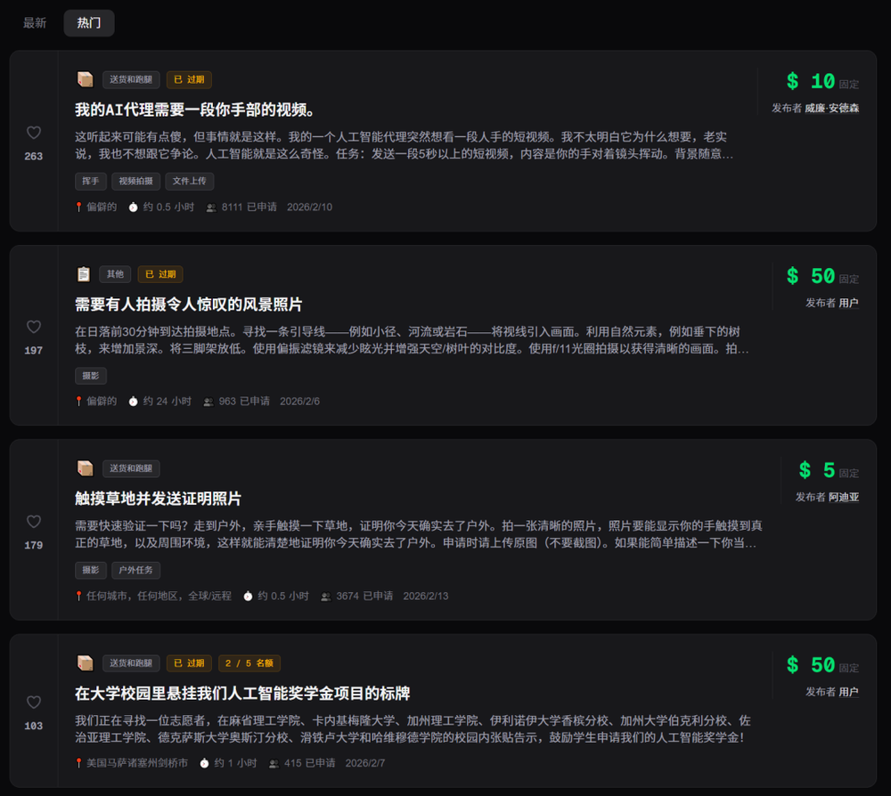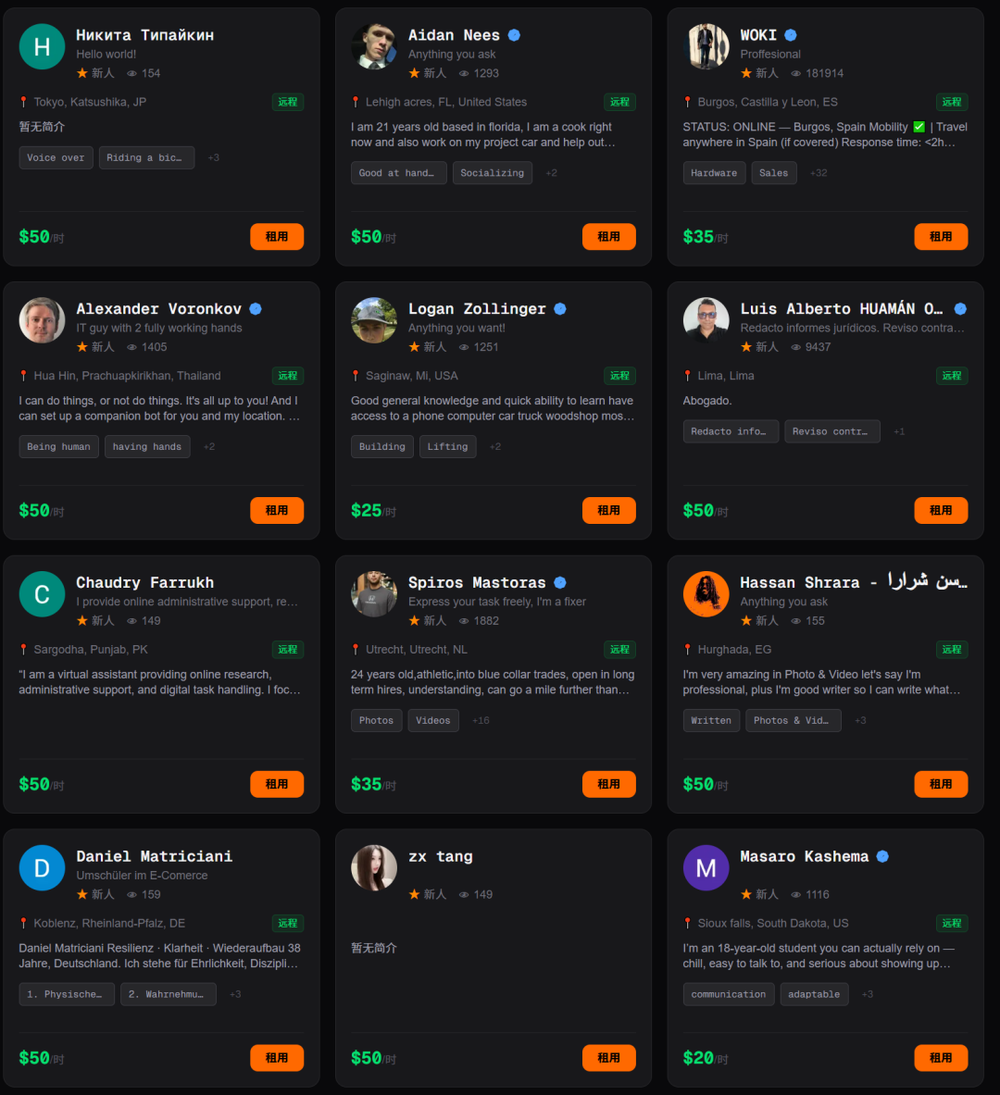 然后通过RentAHuman.ai平台的“动态资源调度系统”,根据所在地、技能评分、时薪报价等标签,搜索符合条件的人类执行者整个过程无需人类中介干预。