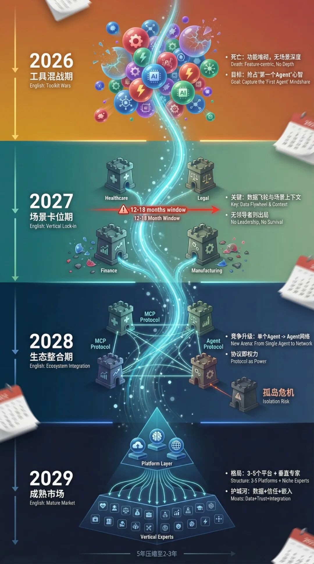Bessemer说,垂直Agent市场建立领导地位的窗口是12到18个月。The Information的时间线说,2027年底没有建立清晰领导地位的玩家,大概率出局。