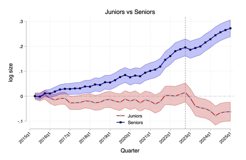 根据哈弗大学的论文《Generative AI as Seniority-Biased Technological Change: Evidence from U.S. R´esum´e and Job Posting Data》显示,自从 2022 年后,积极进取采用 AI 技术的公司初阶员工的招聘人数呈现断崖式的下跌,论文的数据通过 AB 实验的方法,排除掉了宏观经济、行业等外部因素 [4]。