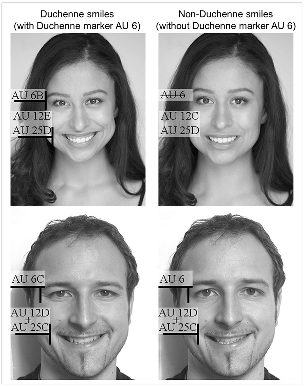 ▷杜乡微笑(Duchenne smile):也被称为真实微笑或由衷的微笑,是一种被科学证实的、反映真实快乐和积极情绪的面部表情。它与我们平时出于礼貌、社交习惯而做出的“假笑”有本质区别。这个名字源于19世纪的法国神经学家纪尧姆·杜乡。他通过电刺激面部肌肉来研究表情,首次科学地定义了这种微笑所调用的特定肌肉组合,因此以他的名字命名。图源:doi:10.3389/fpsyg.2017.01374
