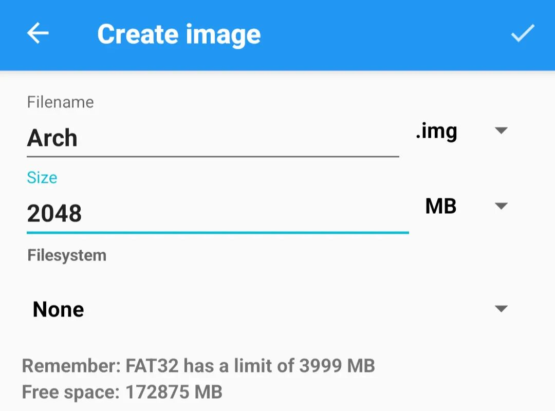 为镜像文件命名,因为只有付费版DriveDroid才能重新调整img文件大小,所以这里的文件大小需要一步到位,要不小于镜像文件的大小,但也不要太大占用多余的存储空间,因为Arch Linux ISO文件大小约为1.4G,为了保险,我将空白文件大小设为了2G,文件系统选择None不指定,因为后面写盘软件会对其格式化,配置完毕点击右上角完成。