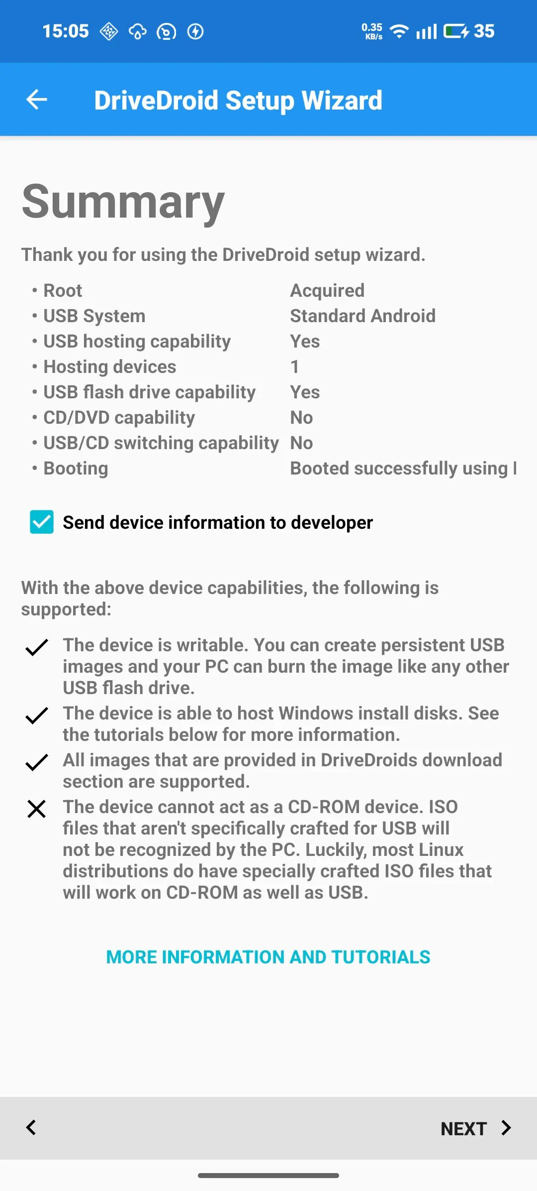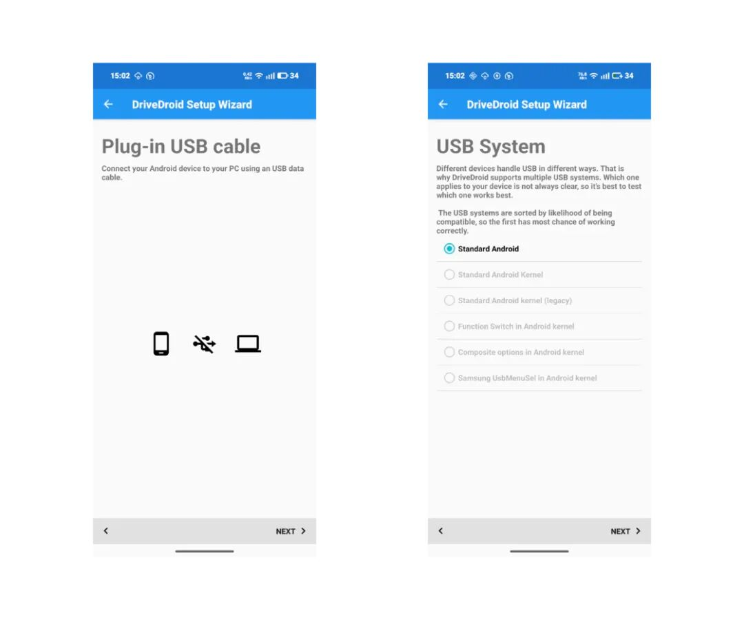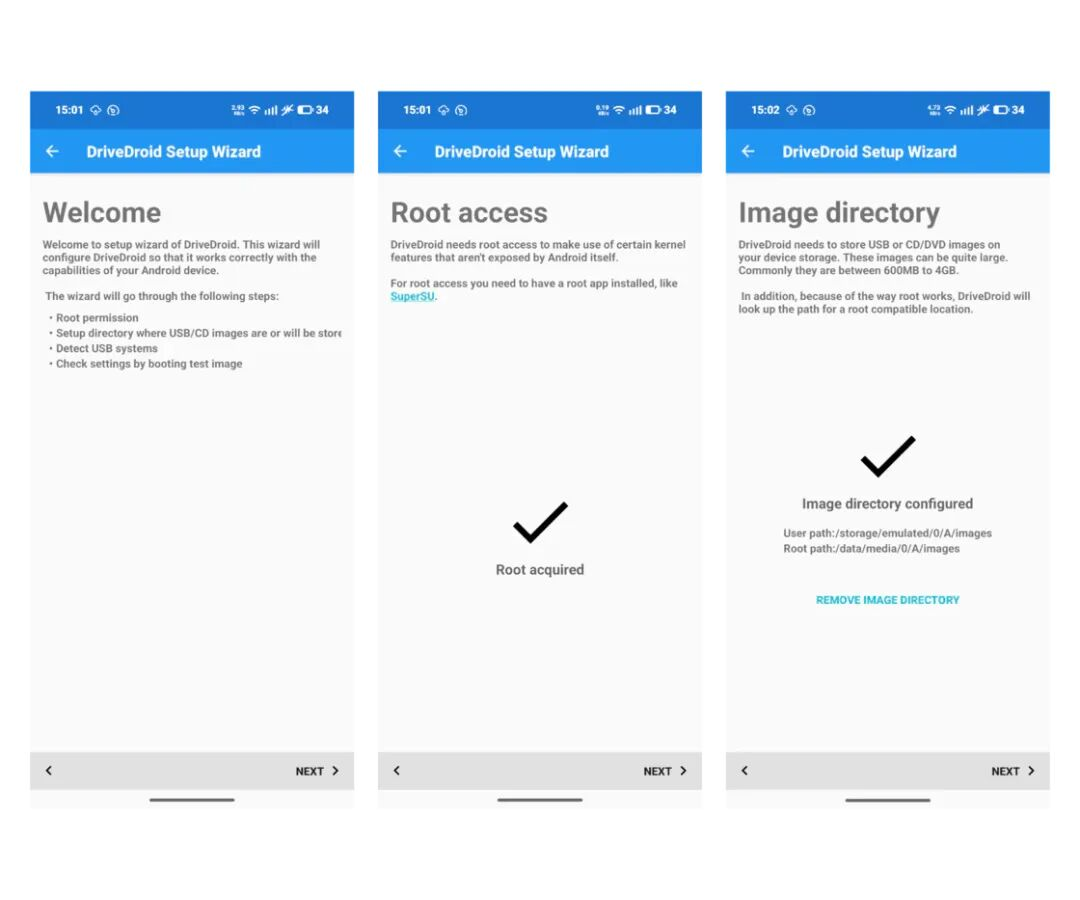 DriveDroid需要ROOT权限才能正常工作,并且因为不同型号和系统的设备对于USB传输的处理方式不同,所以在第一次打开DriveDroid时需要运行一个设置向导来检测APP是否能正常工作。