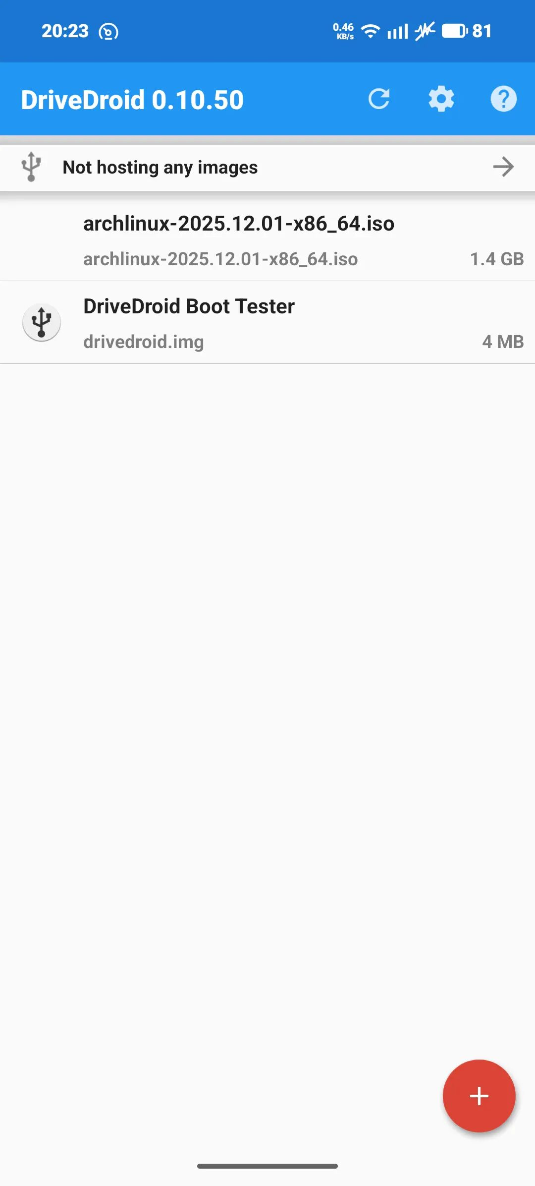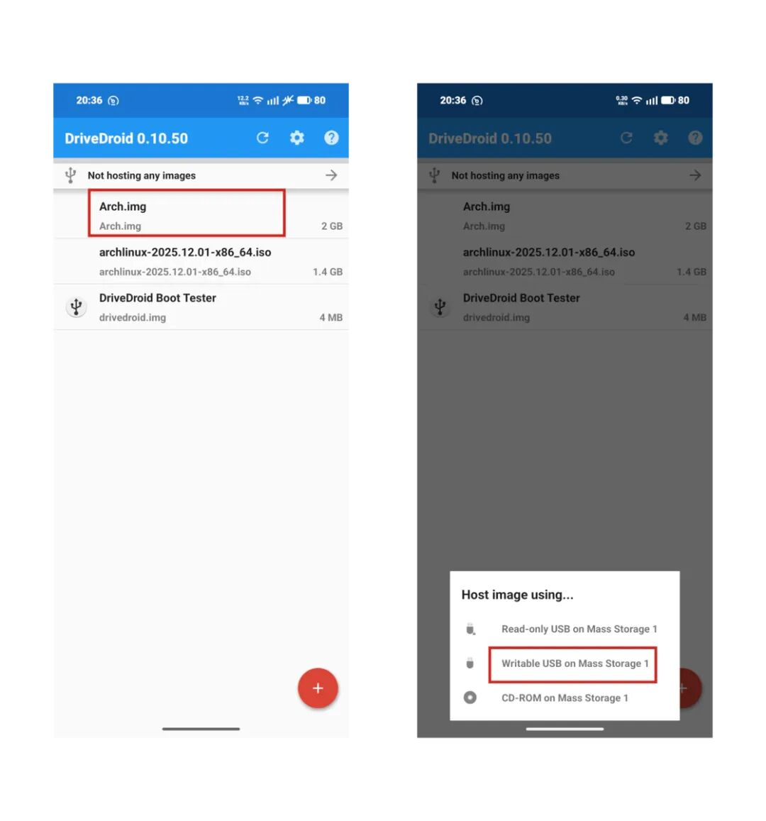 以Arch Linux为例,我可以从国内镜像站下载最新版本的ISO文件,将文件放入之前配置好的用来存储系统镜像的文件夹。在DriveDroid主界面下拉刷新,会发现除了之前运行设置向导时创建的测试镜像,也出现了刚刚下载的Arch Linux镜像。