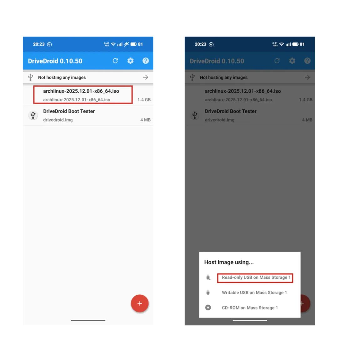点击Arch Linux镜像,会弹出三个选项,分别是只读USB、可读写的USB以及CD-ROM,因为我的设备不支持模拟CD-ROM,且系统镜像不需要读写,所以我选择只读USB,当Arch Linux镜像旁边出现了一个带锁的USB图标,就说明DriveDroid正在把Arch Linux模拟为只读USB启动盘。