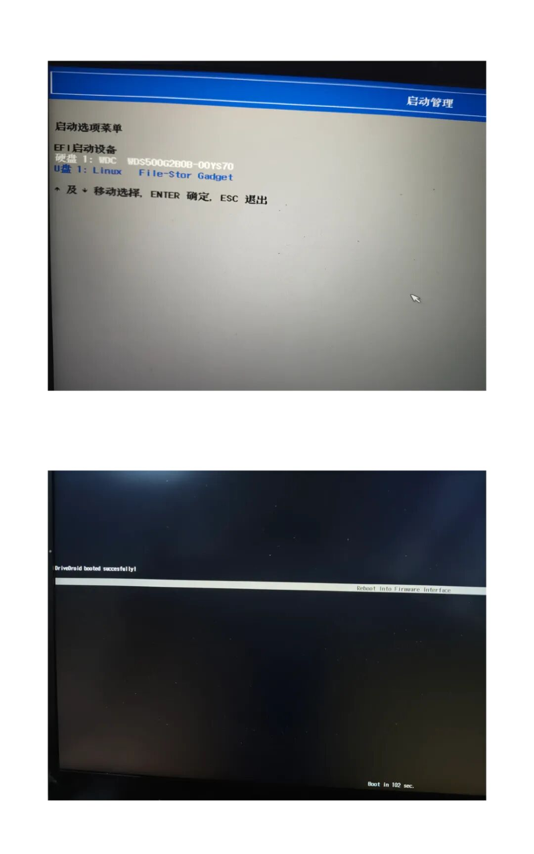 之后不要断开数据线连接,重启电脑进入BIOS,会发现有一个新的启动项可用,确认关闭了安全启动,并选择这个启动项启动电脑,如果电脑能够成功启动并显示「DriveDroid booted succesfully」,就说明一切配置完成了。