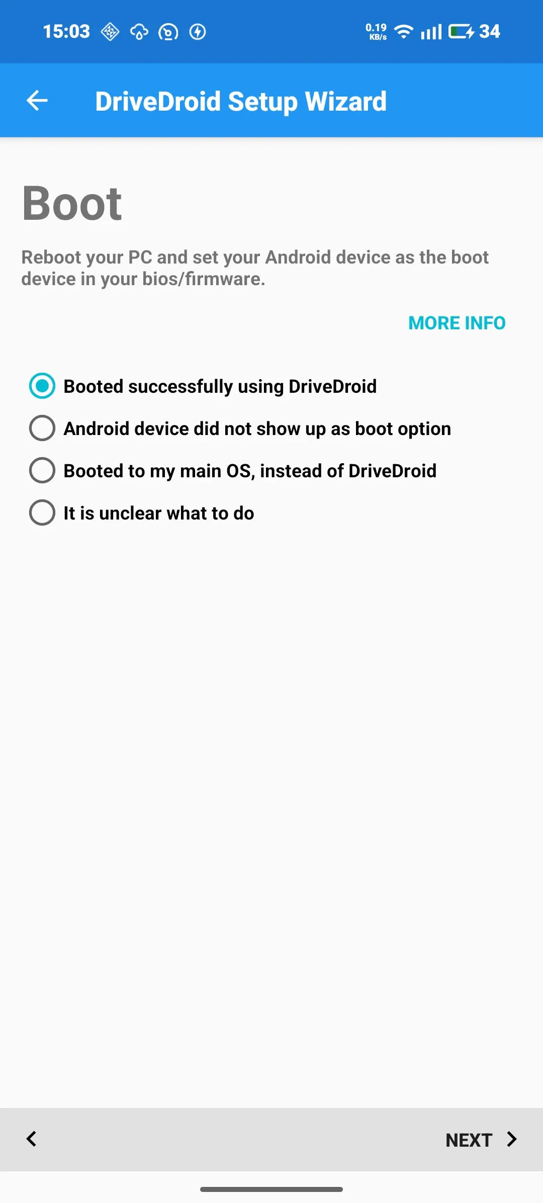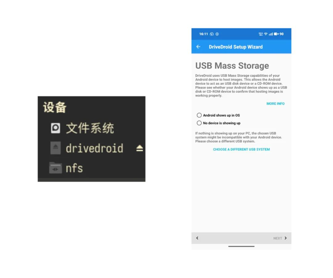 再次点击NEXT后DriveDroid会尝试启动,此时需要在电脑上检查是否出现了一个新的USB设备或是CD-ROM设备,如果出现了,就说明DriveDroid能够正常工作,在Windows上,USB设备可能不会在文件管理器中出现,但是系统会有新设备插入的提示音,这种应该也算是正常工作。如果正常工作就选择「Android shows up in OS」并点击NEXT,如果没有新设备出现,就回到上一个页面尝试不同的USB System,如果都不行,那就可能是设备不兼容,可以尝试安装前文提到的Magisk模块。