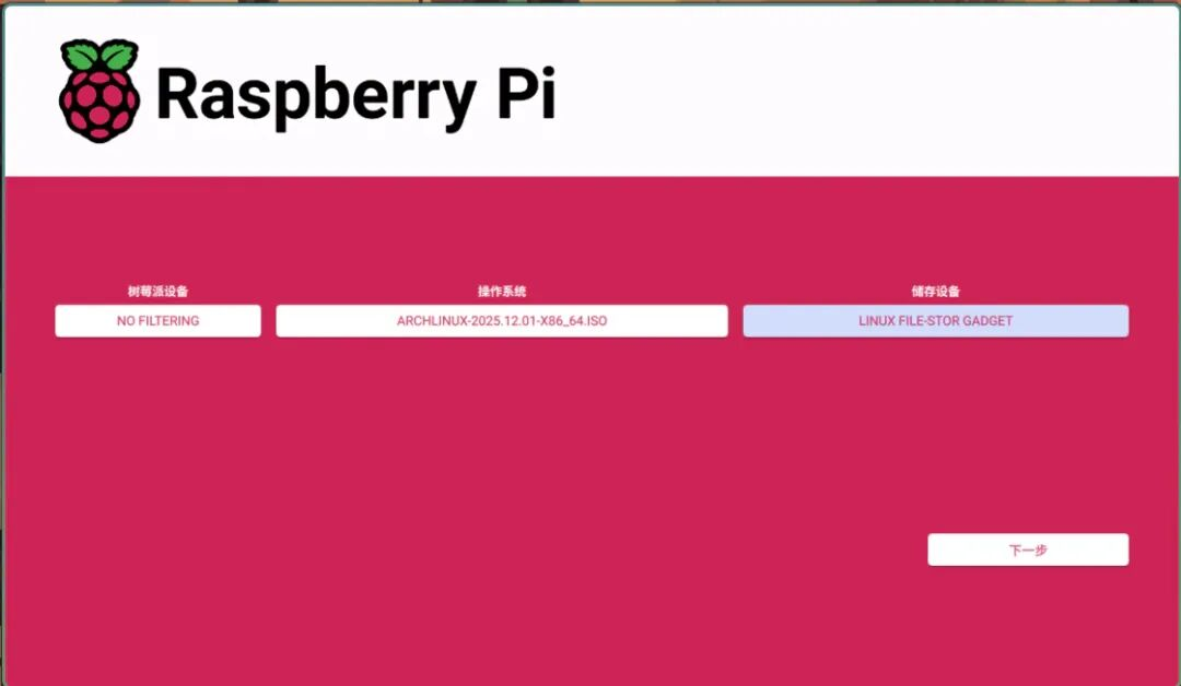 使用数据线连接手机和电脑,在电脑上使用写盘软件(我这里用的是Raspberry Pi Imager)把系统ISO镜像写入到模拟的USB设备上。