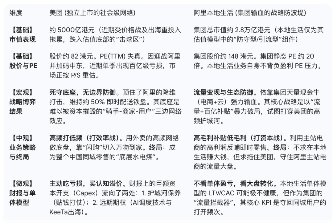 2.美团在“熬底座”:美团现在的惨烈,是段永平所说的“对的事情,忍受哪怕短期难看的结果”。只要美团的日均订单量(网络密度)不崩,它每一分钱的亏损,都在加高别人未来进入同城零售的壁垒。当这场战役结束(阿里放缓补贴),美团闪购跑通的极低边际履约成本,会瞬间转化为非线性的利润大爆发。