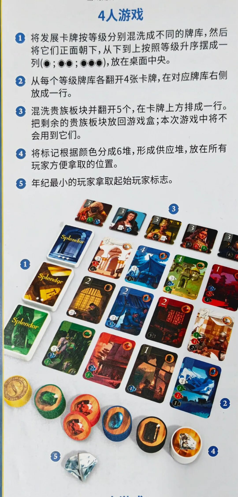 以最经典的4人局为例——桌面有5种不同颜色的宝石筹码,还有可以代替任意颜色的黄金筹码。