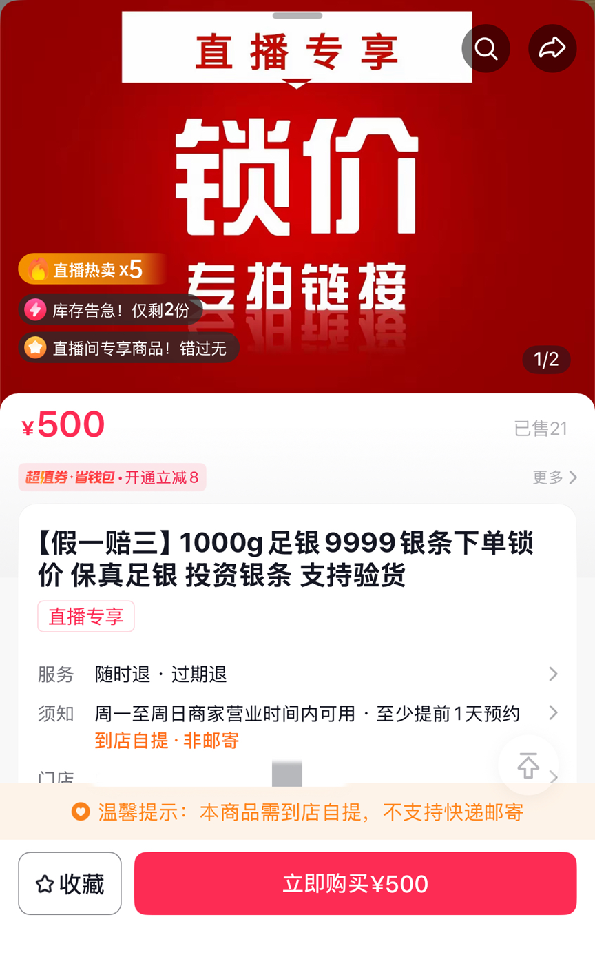 2月25日晚间,在湖南某珠宝自营店直播间内,一名主播以“实物白银每克24.5元,一万克现货在售,机不可失”为卖点反复叫卖,并在直播间小黄车挂出售价500元的直播专享锁价专拍链接。从链接详情页可见,该商品标注为“1000g足银9999银条下单锁价”,商家承诺该投资银条均为保真足银,可支持验货,假一赔三。