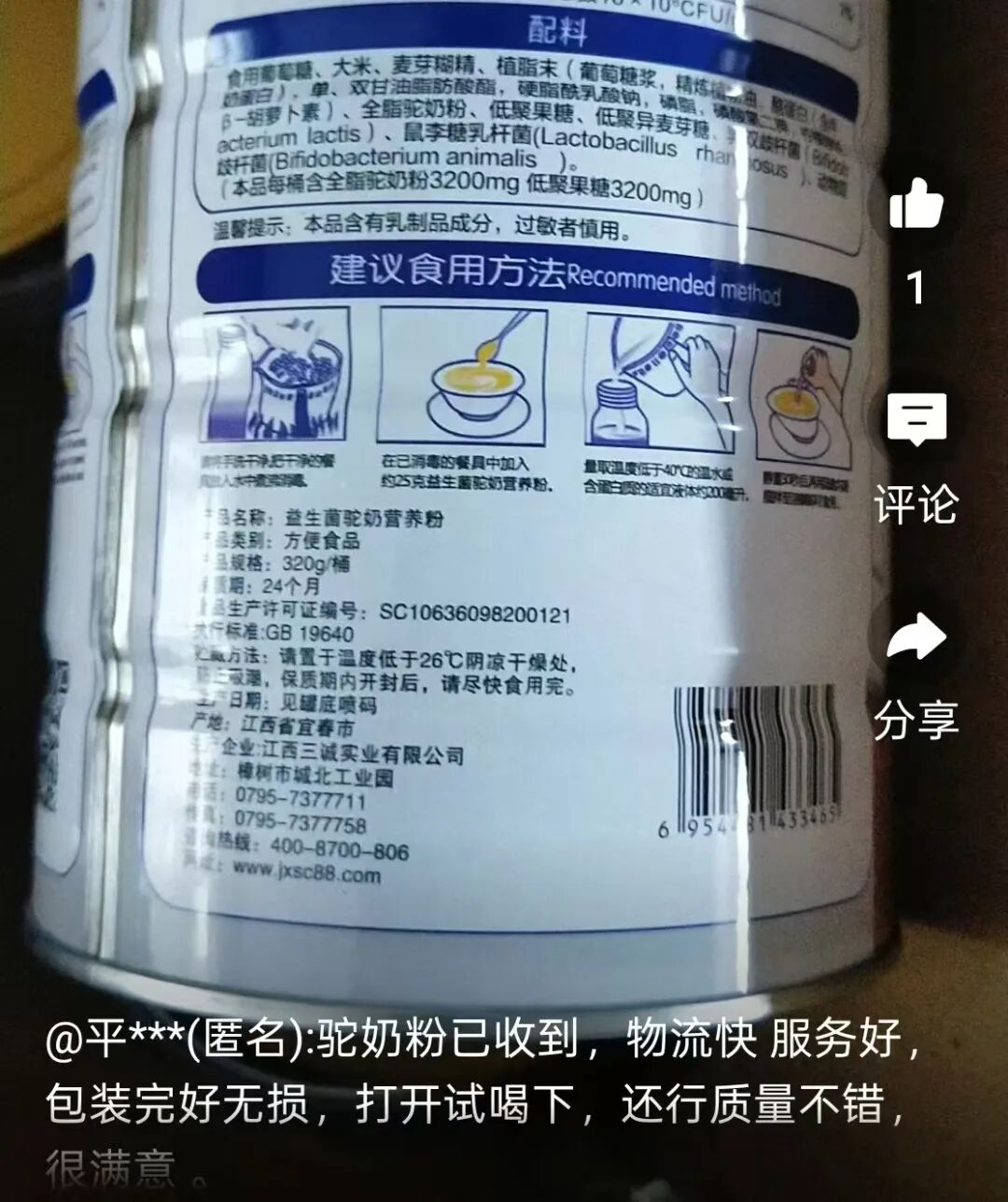 逐条查看,在一个买家晒图中发现这张并不起眼的图片,在最后一行“产品说明”里有这句话:“美赞恩益生菌驼奶营养粉以燕麦为主要原料,添加新疆全脂驼奶粉及其他适量辅料,采用先进工艺技术生产而成。”