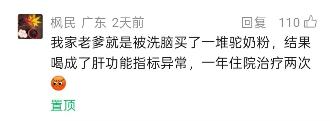 但,质量问题同样也是有隐患的。两天前,一位读者给我留言说:“我家老爹就是被洗脑买了一堆驼奶粉,结果喝成了肝功能指标异常,一年住院治疗两次。”