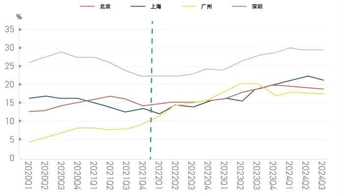 而上海、深圳更早进入这个阶段,有些板块甚至突破了30%,特别是普通甲级和乙级写字楼,早已进入租不动的困境。
