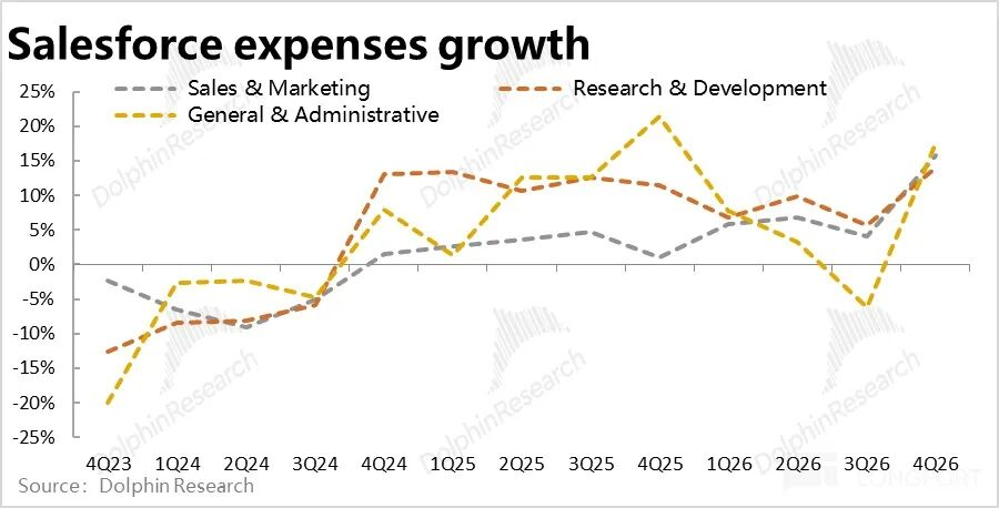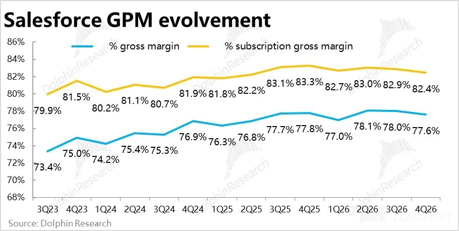 单看核心订阅业务,本季毛利率为82.4%,环比走低约0.5pct,同比更是收缩了近1pct。海豚君认为,很可能是Agentforce等对后台算力要求较多因此毛利率偏低的AI相关业务的拖累。