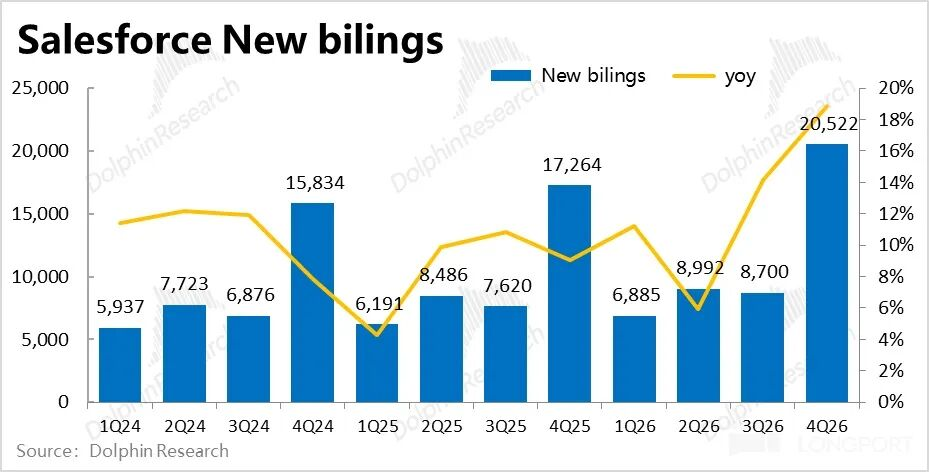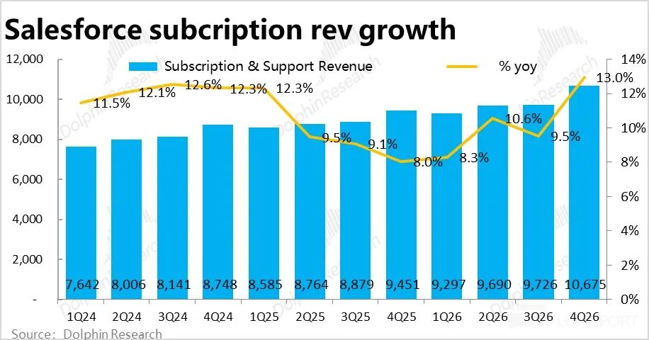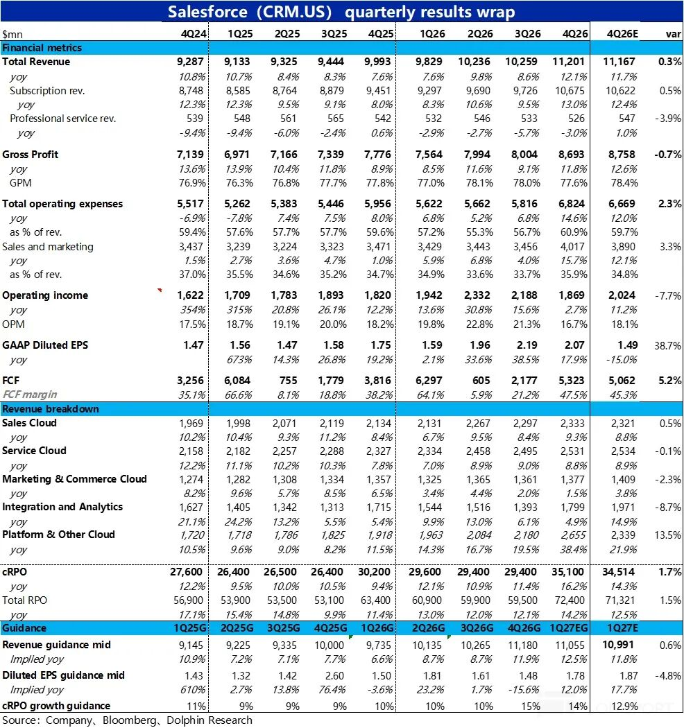 近期在“AI杀死SaaS”叙事下,受冲击最严重之一的CRM,美东时间2月25日美股盘后公布2026财年4季度财报(截止1.31日),整体来看业绩表现一般。