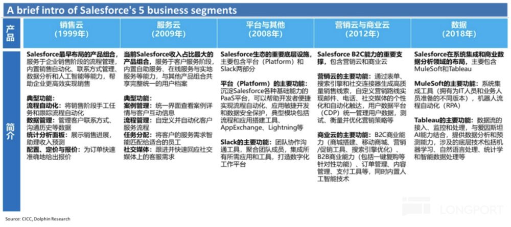 ⑤平台云(Platform&others):Salesforce其他SaaS服务依赖的基础设施和服务,类似PaaS(Platform-as-a-service)。也包含类似于微软Teams的团队协作SaaS服务Slack。