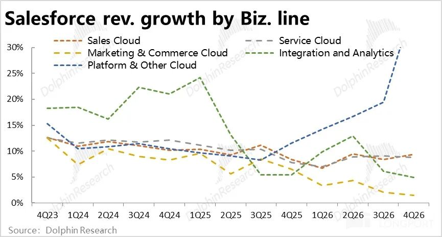 1、通过上文分析可见,Salesforce本季业绩表现显然算不上好。剔除并表和汇率的利好后,公司原有业务的增长实际并未提速,反而在继续放缓。管理层年前大会上指引的营收触底反弹截至本季并没有体现。(算上汇率和并表利好,总营收增速确实是修复到了10%以上,但这没有多大意义)
