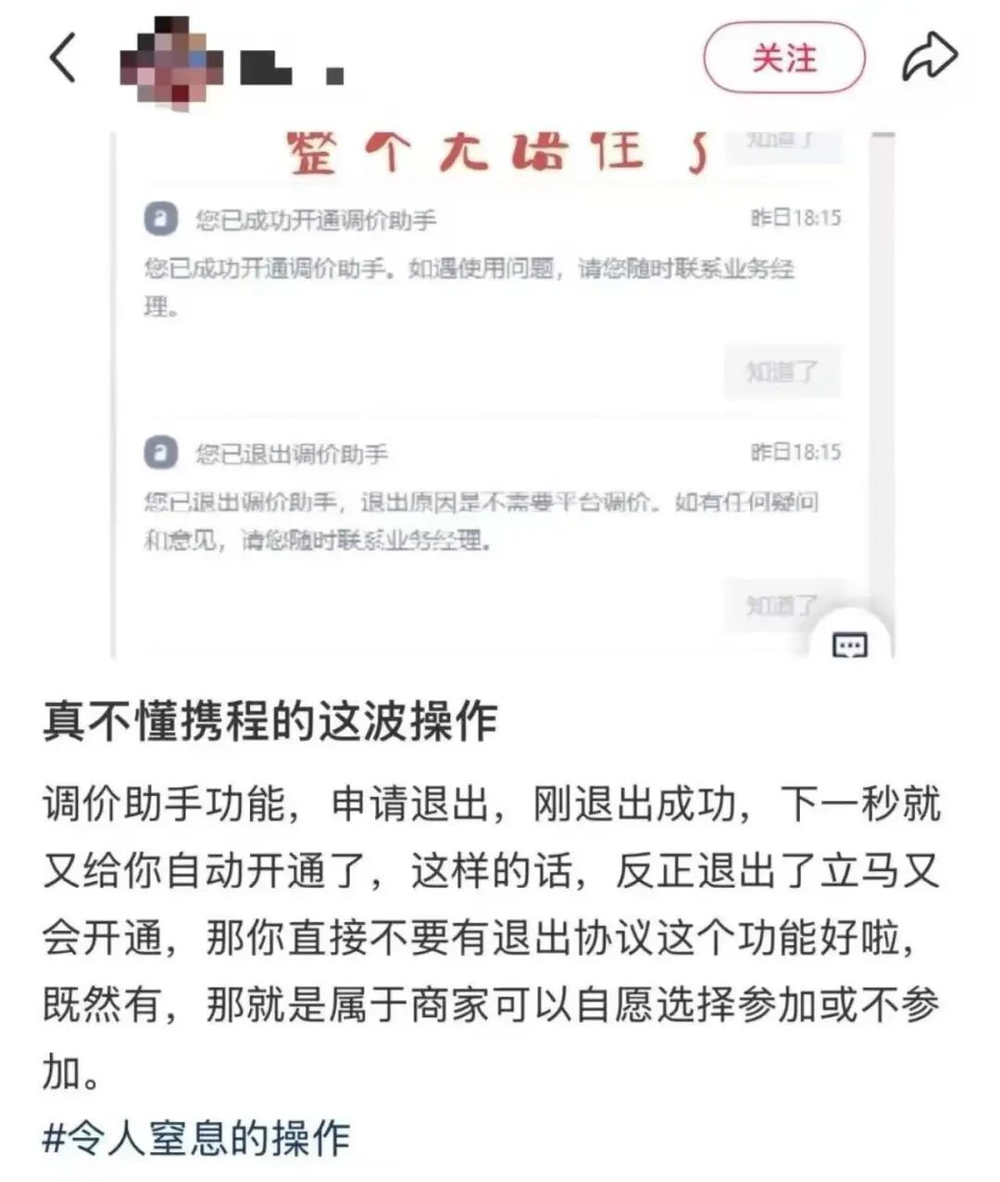 这玩意儿是所有酒店老板的痛,携程可以直接越过酒店老板,擅自修改酒店房价,商家只能被迫接受。随便一搜,就可以看到类似武汉某酒店上千元的房型被系统强行降到500元去卖的新闻。