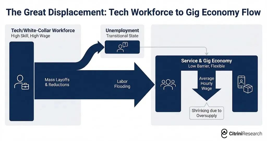上图体现了劳动力市场的流向及其后果。高技能、高工资的科技/白领阶层经历“大规模裁员”后,通过失业过渡,涌入准入门槛低的“服务与零工经济”。