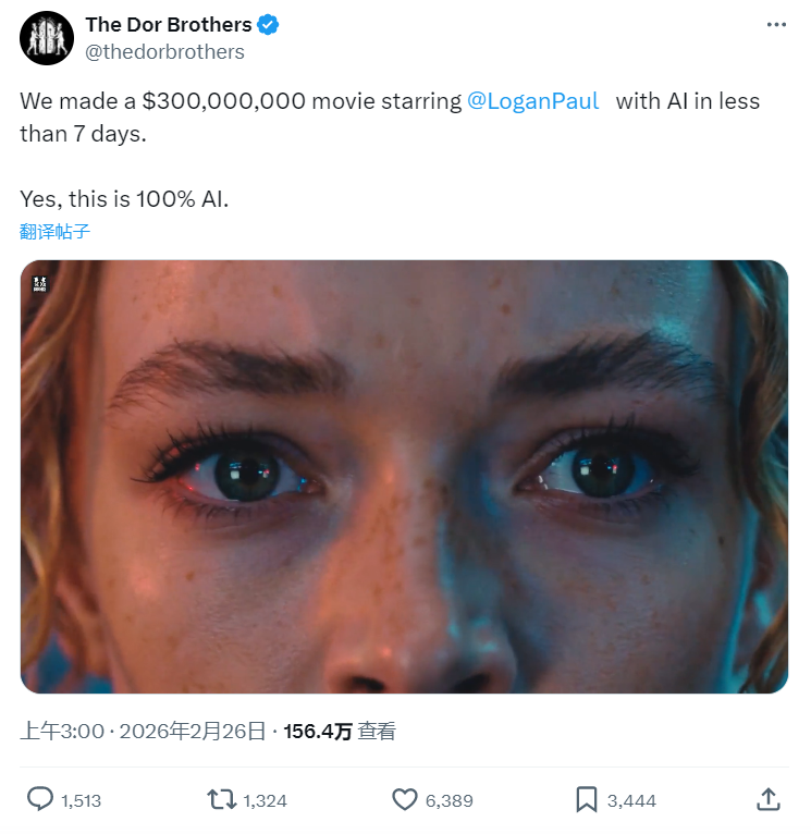 一天前,X平台刚刚被一条推文炸了场子。账号@The Dor Brothers发布了一段时长14分左右的视频,并配文:我们利用AI技术,在不到7天的时间内,制作了一部由@LoganPaul主演、成本高达3亿美元的电影。是的,这部影片100%由AI生成。
