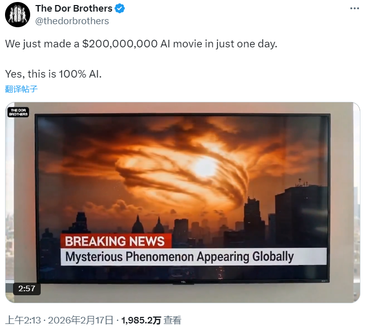 1985万的播放量背后,同样是一个令传统电影人窒息的真相:这段拥有“感知价值2亿美元”特效的视频,没有摄影机、没有演员,更没有庞大的VFX团队,仅是利用刚出来不久的Seedance 2.0,在24小时内完成。