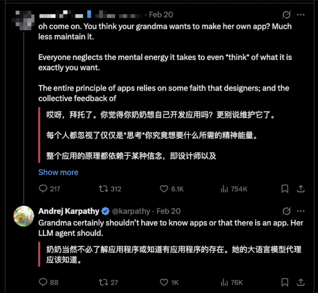 卡帕西的回复只有一句话,信息量却很大,在我看来甚至比他的正文更值得琢磨。他说:“奶奶当然不必了解应用程序或知道有应用程序的存在。因为她的AI助理应该知道这些。”