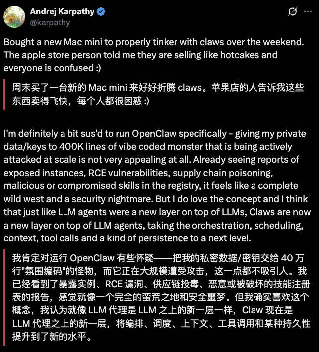 这个词主要来源于卡帕西最近在X上分享的一件趣事:他买了一台新电脑,也就是Mac Mini,专门用来跑本地的AI智能体。一位苹果店员告诉他,这个设备最近卖得像北美早餐店的热松饼一样火,基本上热气腾腾刚上架就被买光。
