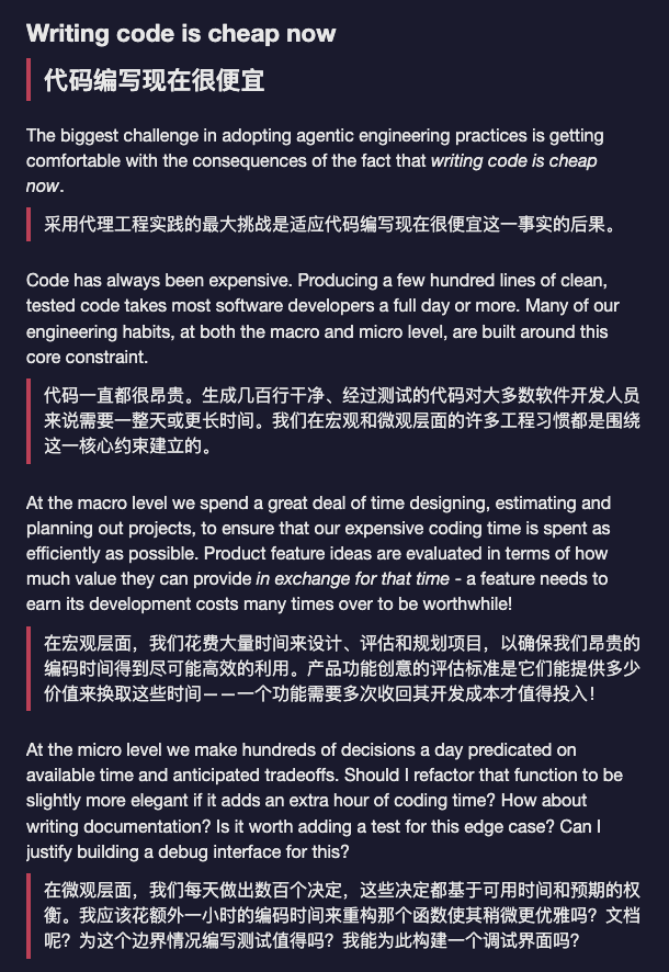 就在最近,也就是2026年2月23日,西蒙发布了一个新项目:Agentic Engineering Patterns(代理工程模式)。这个项目的第一章,标题就直击要害:“Writing code is cheap now”,也就是“写代码现在很便宜”。