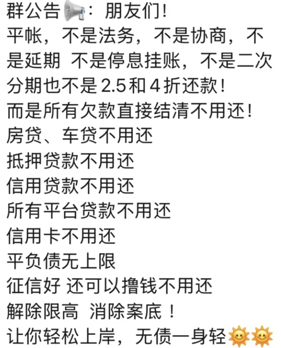 接着你会被拉进一个名为“债务重组”“上岸联盟”之类的群聊,这里的气氛极其亢奋,振奋人心的群公告仿佛超市特价甩卖:不是2.5折,不是4折,是通通不用还!