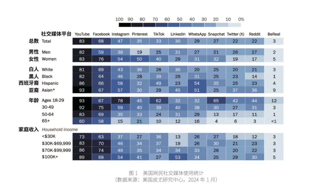 根据皮尤研究中心(Pew Research Center)及Statista行业统计数据,截至2025年底,YouTube仍然是全球影响力最大的数字视频平台之一。其全球月活跃用户规模已超过25亿,在网站访问量排名中长期位居前列,仅次于Google。在美国市场,约83%的成年人使用YouTube,使其成为覆盖率最高的在线视频平台之一(图1)。美国用户规模预计约为2.39亿人,显示出平台在成熟市场依然保持稳定增长态势。