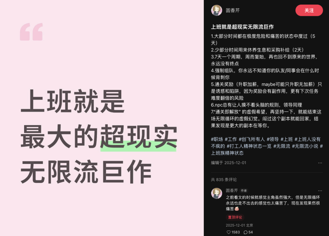 引用小红书上一位创作者的话语,这种类型文学的叙事魅力“恰恰在于它把那种弥散在我们周遭的、无形的压抑感,变成了一套具体、冰冷、必须背诵却又自相矛盾的守则”。
