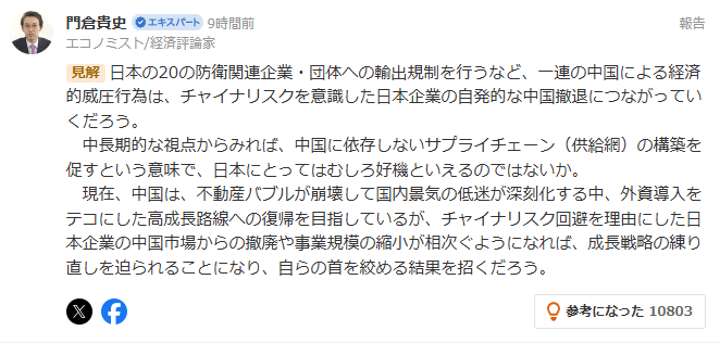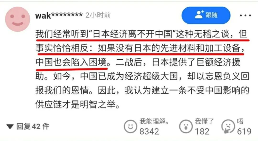 有个叫门仓贵史的日本经济评论家,说这次制裁正好能让日本认清中国的嘴脸,并促使本国构建起完全不依赖中国的供应链,对日本来说是个千载难逢的机遇。