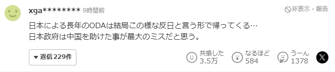 “日本长年提供的政府开发援助(ODA),最终却以这种反日的形式回馈回来……我认为日本政府最大的失误,是曾经援助过中国。”